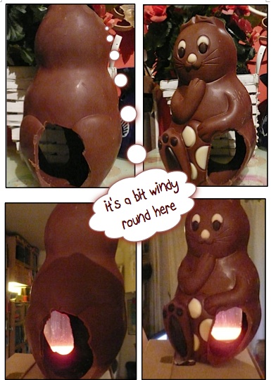 Now this is getting beyond a joke and a bit…may I say completely boring for everyone. I think the best thing for me to do is to go into a period of denial.. still not a river in Egypt. ( The old ones are still the best) If I pretend this is all not happening, maybe it will just go away. Maybe if I just step away from the rabbit that has a large hole in its nether regions, the whole disastrous situation will go away. I will open my eyes and my rabbit will be whole, rather than holy. Perhaps that is not right either, as I am not looking for anything spiritual here.It’s all material here… I JUST WANT MY BUNNY BACK. Though praying might help. A bit of divine intervention could be the key to bringing back my bunny’s missing bits. We still have a long wait until Easter and I am going to find it really difficult to look at my bunny’s injustices and injuries, yes, feel I have to go as far as calling them such. Important to name it…not pretend it is not an injury when it is so obviously is. I hear the bunny’s ears where actually bitten off. Please…can this be the last of all this for a while…I do not know if I can take much more.